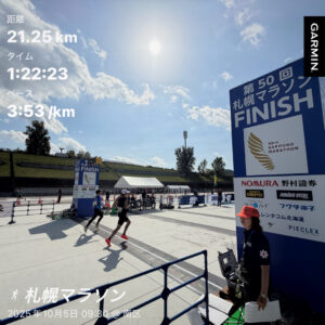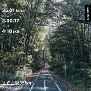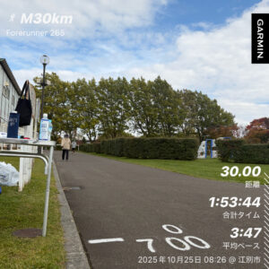 秋のハーフ2戦を終えた後はフルマラソン(つくば)向けの練習を積み続け、フードバレーとかちハーフに挑む前週には”つくば4週間前”の仕上げとして、ハシルコト北海道の練習会として仲間とMペース30kmを完遂。