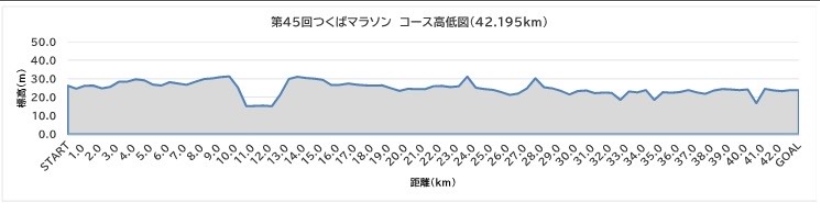 新コースとなったつくばマラソンですが、コース高低図や大会が用意したコースの動画を見ると、そこまで大きなアップダウンはないと感じられました。