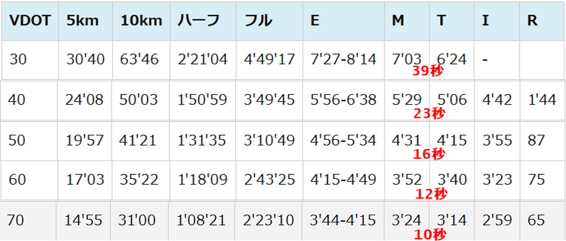 前述のVDOT表から見たTペースとMペースのスピード差について、必ずしもその表の通りの”差”で走らなければいけない、ということにはなりません^^;